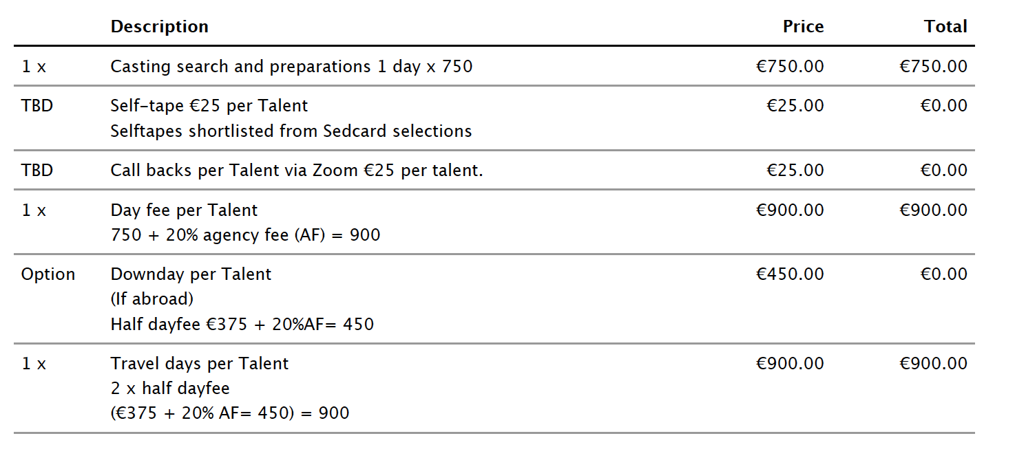 Shooting day fee - including casting and fitting - 2.500,- EUR